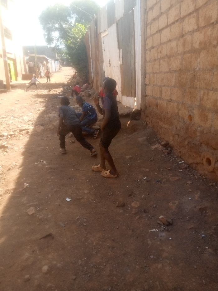 A group of children are playing in a dirt road between buildings. One child stands with arms raised, while another bends over and a third sits on the ground. The buildings are constructed of brick and corrugated metal. The road is uneven and dusty, with visible debris. Other figures can be seen further up the road, suggesting a residential area. The lighting suggests it is daytime.