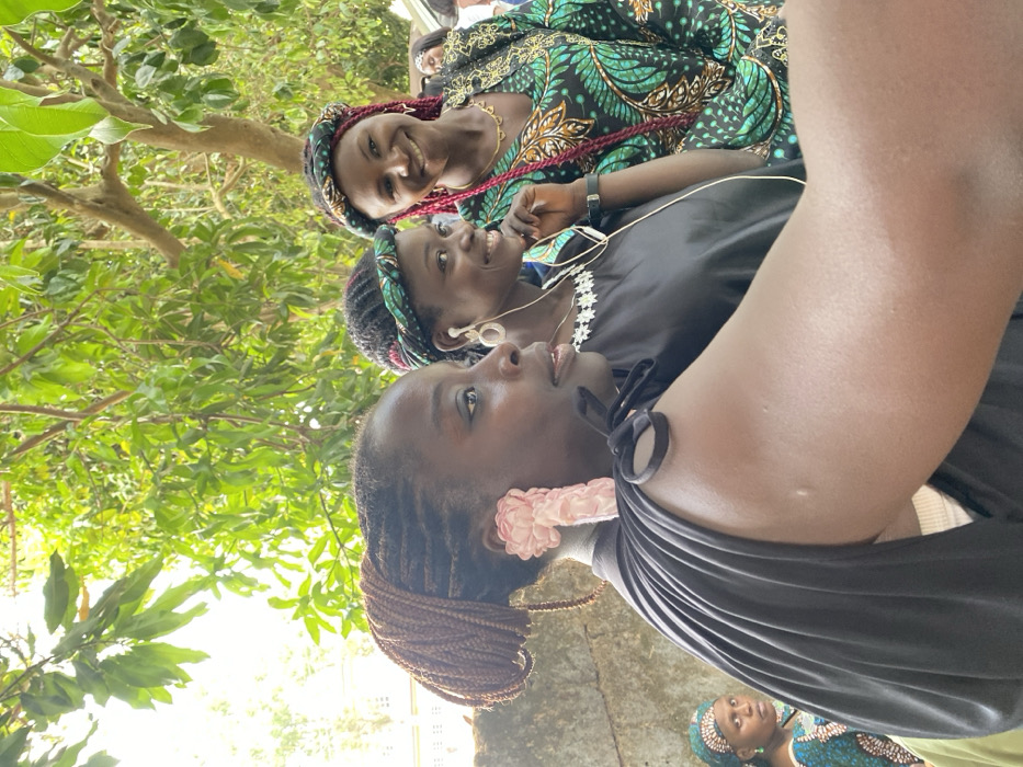 The image displays an outdoor social gathering in Vom, Nigeria, centered on three women captured in a close-up arrangement. In the foreground, on the left, a woman with dark skin is presented in a profile view, facing towards the right side of the frame. She has a complex brown braided hairstyle gathered at the back and wears a prominent, layered pink floral earring on her visible ear. Her attire includes a black top with a shoulder strap tied into a bow. Adjacent to her, in the mid-ground, a second woman with dark skin smiles directly towards the camera. She features dark, braided hair styled under a green and black patterned headwrap. White earbuds are visible in her ears, and she wears a black top with white floral embroidery along the neckline, along with a dark-banded watch on her left wrist. To her right, positioned slightly behind, a third woman with dark skin also smiles towards the camera. She has long, red/purple braided hair, an identical green and black patterned headwrap, and a vibrant green and black patterned dress. A delicate gold-colored necklace adorns her neck. In the far background on the left, a fourth woman, partially obscured, is visible wearing a green headwrap and patterned clothing, looking forward. The upper background is dominated by lush green foliage from trees, while a light-colored wall or building is faintly discernible on the far left. The scene is illuminated by bright daylight.