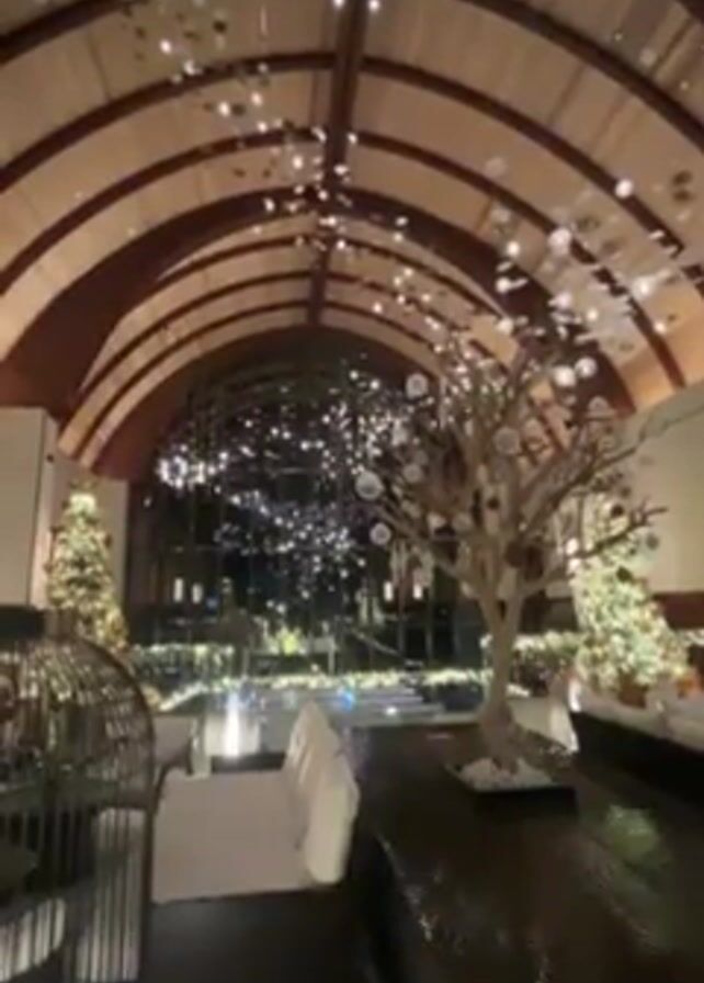 The camera pans across the interior of a large, warmly lit room. The room has a high, arched ceiling made of wood. From the ceiling hang many decorative lights. In the distance is a large window overlooking an outdoor space with bright lights. To the left and right are decorated Christmas trees. In the center of the room is a decorative tree with silver ornaments. There is also seating and other decorative items scattered throughout the room.