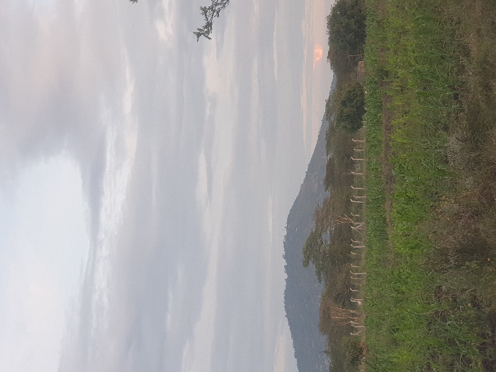 A serene landscape under a cloudy sky features a verdant field bordered by trees and a simple fence. A gently sloping hill rises in the background, partially obscured by the foliage. Hints of a muted sunset add a subtle warm glow to the horizon. The overall scene conveys a sense of tranquility and rural beauty.