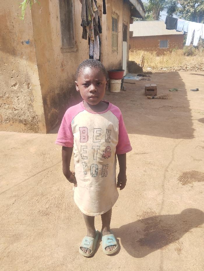 A young Black child stands centrally in an outdoor, daytime scene in Unguwan Rimi, Nigeria
