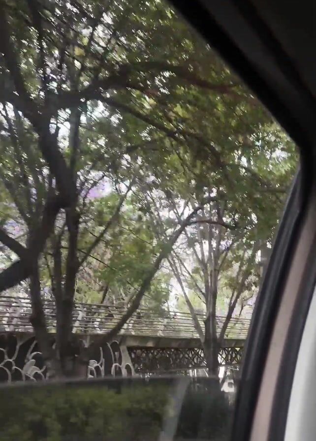 view from the inside of a moving car looking out the side window. The camera is shaky. Outside, trees and a pedestrian bridge over a road are visible. The sky is overcast. The trees are mostly green but some have purple flowers. The bridge is metal with a latticework design. There are buildings visible behind the trees and bridge. The car window frame is black. The car is moving at a moderate speed.