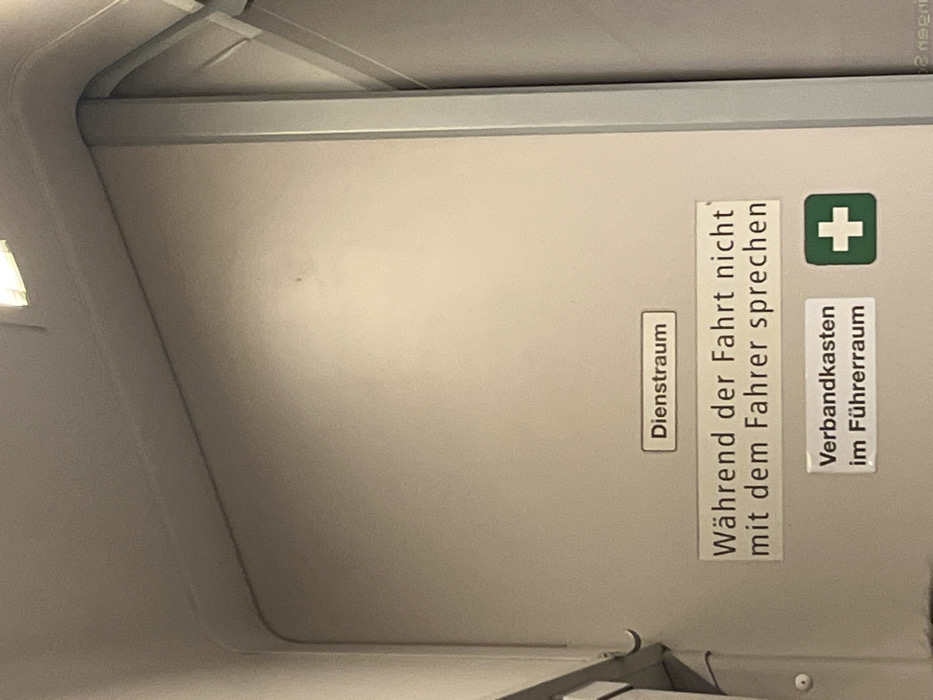 The image displays a section of a train's interior. A sign indicates "Dienstraum" (service room). Adjacent to this, another sign reads "Während der Fahrt nicht mit dem Fahrer sprechen," prohibiting interaction with the driver during the journey. A green cross denotes a first aid kit ("Verbandkasten im Führerraum"), located in the driver's cabin. The background consists of a smooth, neutral-colored surface, possibly a door or wall, with ceiling and framing elements visible.