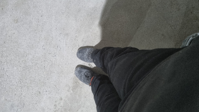 pair of feet wearing dark gray or black moccasin-style shoes. The shoes appear worn and dusty. The person is wearing black pants. They are standing on a concrete surface that is lighter in color, likely a sidewalk or floor. A shadow is visible near the upper right portion of the image.