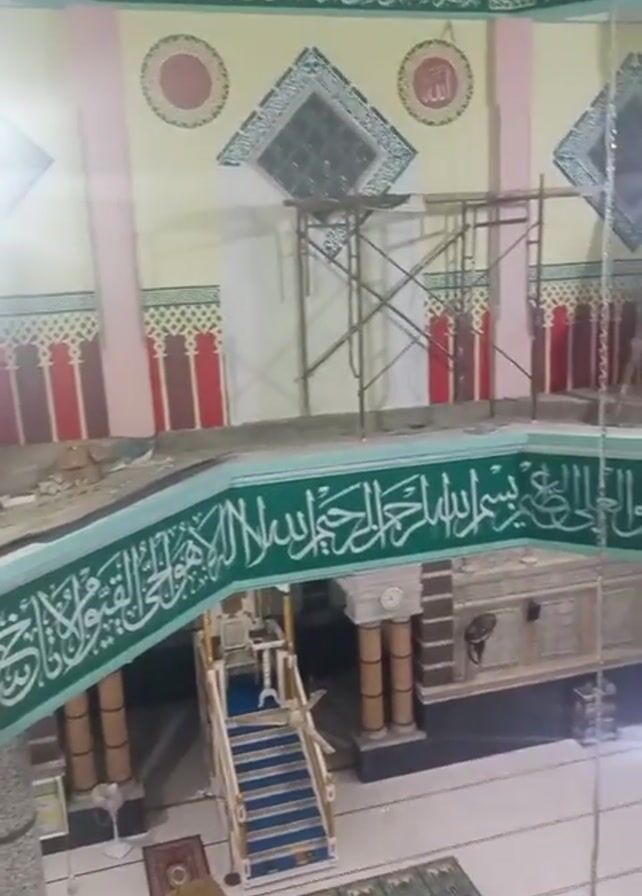 interior of a building, possibly a mosque, under construction or renovation. The camera pans upward, revealing the multi-tiered architecture, including ornate Islamic calligraphy and geometric patterns painted on the walls. There is scaffolding in place, suggesting ongoing work. The camera then focuses on the ceiling, which features a dome with decorative elements. The color scheme is predominantly light, with accents of green, red, and gold.
