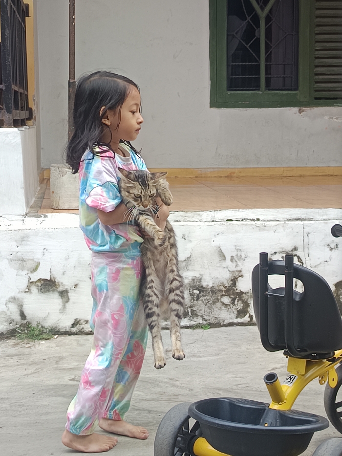 A young girl, approximately 5-7 years old, with long dark hair, stands barefoot on a paved surface in Maleber, Indonesia. She is observed in profile, facing right, wearing a tie-dye patterned long-sleeved shirt and matching long pants in pastel shades of pink, blue, and yellow. She holds a lean, brown and black striped tabby cat vertically in her arms, its front paws tucked and hind legs dangling. The background features a light-colored, possibly white or off-white, weathered building with visible staining and peeling paint at its base. A raised, tiled porch or platform with an orange-brown trim runs along the building. A dark green window frame with decorative security bars is visible on the upper section of the building. To the immediate left of the girl, a section of black metal railing is partially visible. In the lower right foreground, a portion of a yellow child's tricycle with black wheels and a black seat/storage basket is present. The ground is a light gray paved surface, with some greenery visible at the base of the building wall.