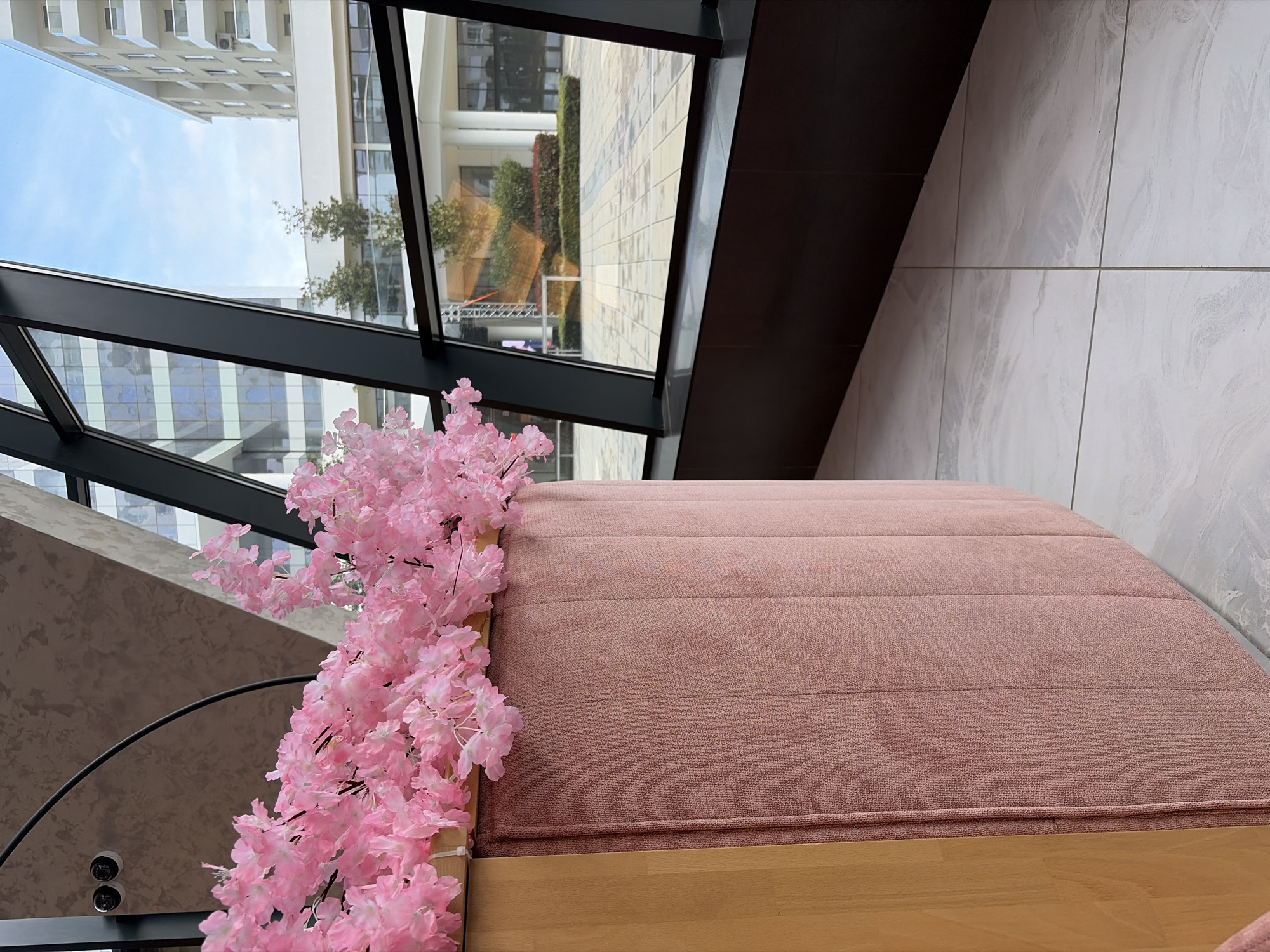 An interior space in Burgas, Bulgaria, features a curved, channel-upholstered seating unit in dusty pink on the left, topped with numerous artificial pink cherry blossoms