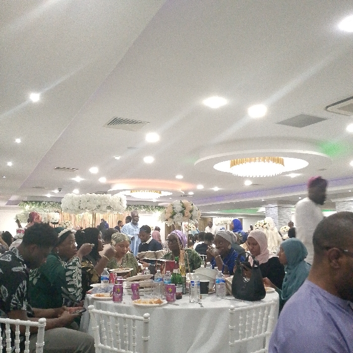 The image depicts an indoor celebratory event occurring within a large, well-lit hall. No specific visual identifiers are present to determine a precise location within Birmingham, United Kingdom. Approximately 20-30 individuals are visible, predominantly adults, many of whom are wearing traditional attire and religious head coverings, indicative of a cultural or religious gathering. Attendees are seated around multiple white-clothed circular tables, utilizing white chiavari-style chairs. In the immediate foreground, a table is laden with multiple plates containing partially consumed food, various beverage cans (including purple and pink colored "Royale" branded cans), bottled water, and assorted cutlery. Individuals at this table are engaged in eating, conversing, and operating mobile phones. The hall features a white ceiling equipped with numerous recessed spotlights and suspended decorative light fixtures, including a prominent circular chandelier with gold trim. Air conditioning vents are visible on the ceiling. The event space is adorned with elaborate floral arrangements, primarily white and light-colored, positioned on tall stands on tables and forming part of a decorated backdrop situated in the mid-ground. The overall environment presents as a formal or semi-formal celebratory event, possibly a reception or banquet.
