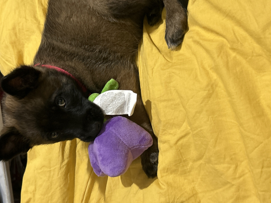 - "A dark-furred puppy, wearing a thin red collar, is positioned on a rumpled bright yellow fabric surface in the city of Hrabarsko, Bulgaria" by FM-sT5Bj1, licensed under CC BY 4.0