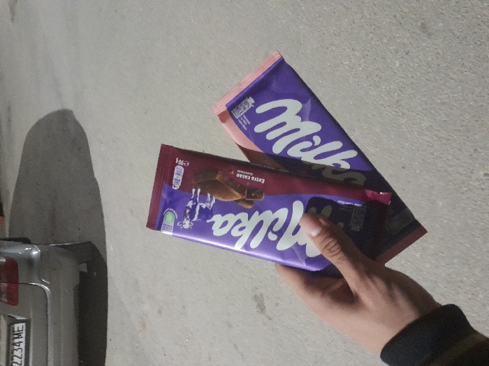 - "A left hand holds two Milka chocolate bars, positioned diagonally over a textured, light grey concrete or asphalt surface" by FM-ix6Mf2, licensed under CC BY 4.0