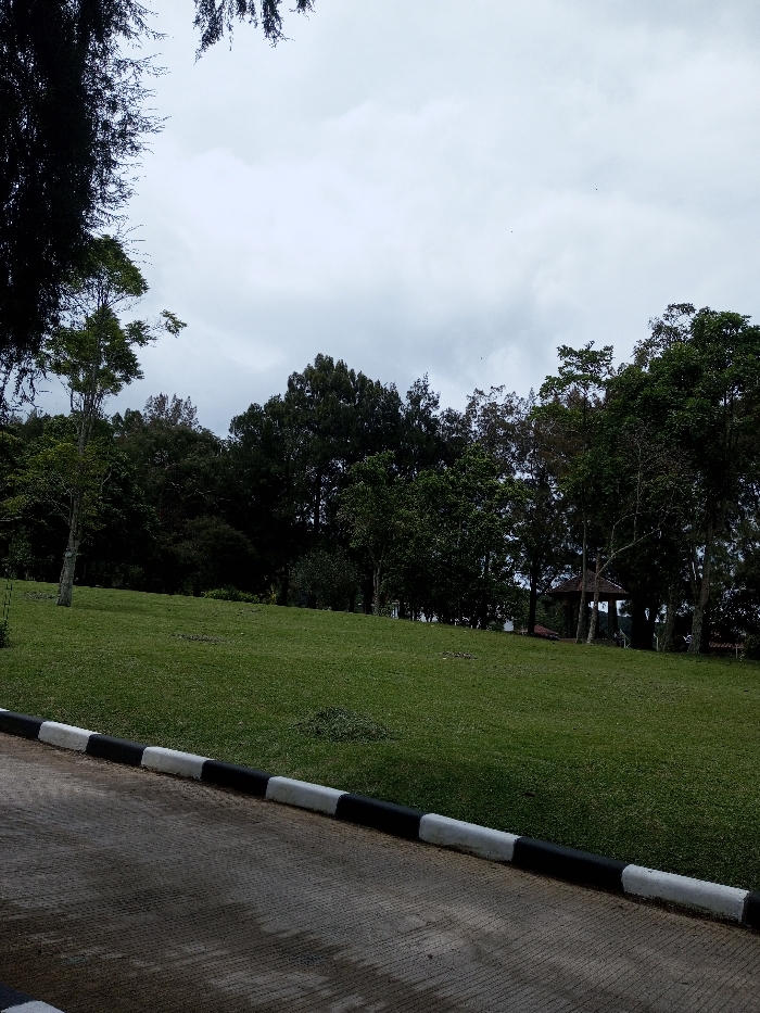 A cloudy sky hangs over a verdant park. A sloping green lawn leads towards a line of trees and a small gazebo structure. The trees vary in height and density, creating a layered backdrop. A paved road with a black and white curb runs along the bottom of the frame, adding a contrasting linear element to the natural scene. The overall impression is one of tranquility and overcast weather.