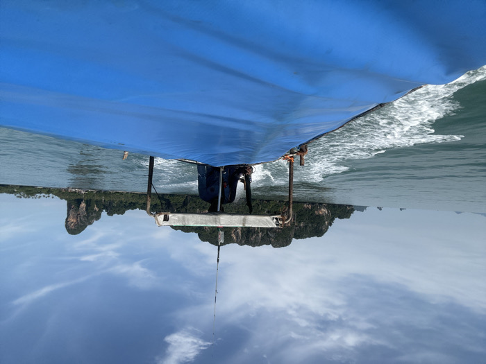 The image displays a traditional Thai longtail boat navigating the waters off the coast of Ao Nang, Krabi Province, Thailand. The perspective is from the stern of the boat, looking forward. The boat features a large, royal blue canvas tarp covering its main passenger area. Wooden structural elements are visible at the stern, from which a thin, tall antenna or fishing rod extends vertically. A single individual, likely the boat's operator, is partially visible at the stern, positioned behind the blue tarp, wearing a dark shirt and facing away from the camera. The boat is in motion, evidenced by a distinct white, foamy wake trailing behind it in the greenish-blue sea. In the background, several towering limestone karsts and islands, densely covered in tropical green vegetation, rise prominently from the water. A particularly large and distinctive karst formation is visible towards the right side of the frame. More distant, smaller landforms are visible on the left horizon. The sky above is a bright blue with scattered white clouds, indicating clear daylight conditions.