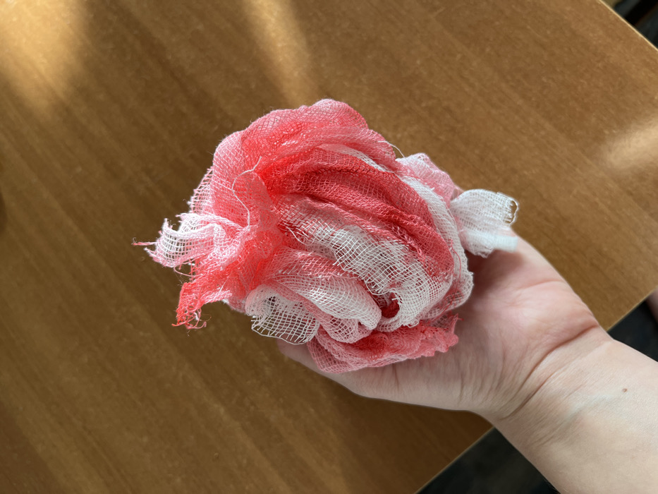 - "A light-skinned human hand, partially visible, grasps a crumpled mass of loosely woven white fabric, heavily stained with red, against a light-brown wooden surface" by FM-ktXuK2, licensed under CC BY 4.0