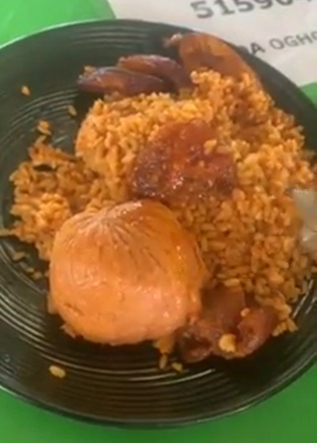 A close-up shot shows a black plate filled with what appears to be jollof rice, fried plantains, and a large, ball-shaped food item, possibly moin moin