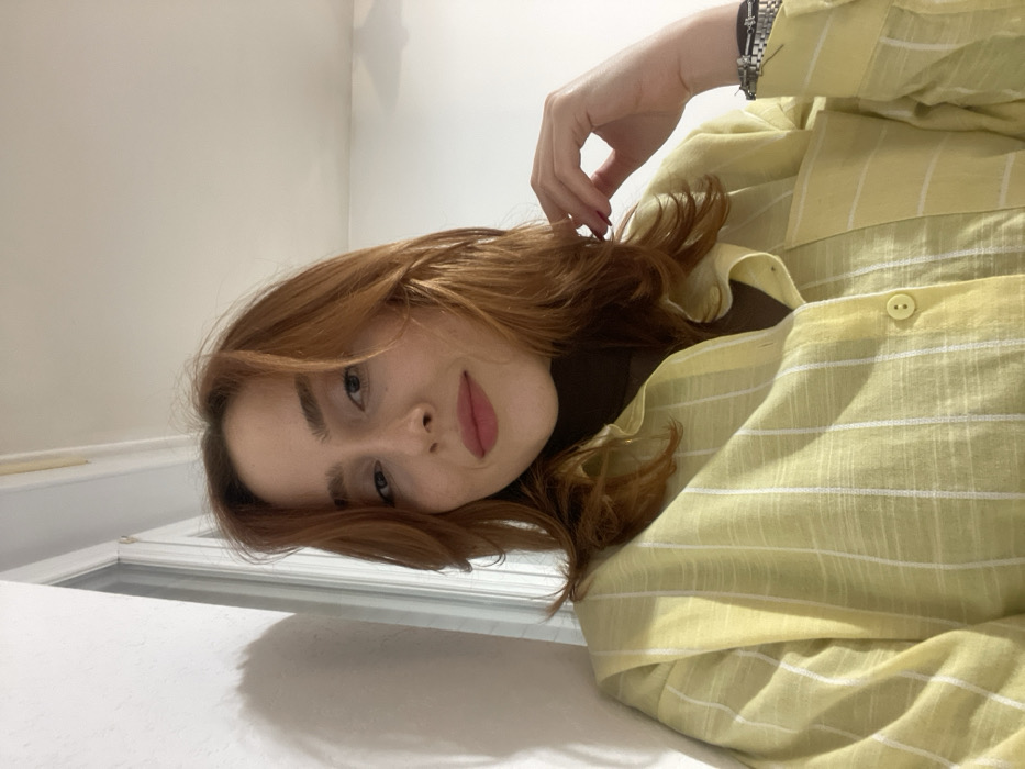 The image presents a head-and-shoulders portrait of a female subject in an indoor setting in Reims, France. The subject has reddish-brown, wavy, layered hair that frames her face, brown eyes, and light pink lipstick. She is wearing a dark brown turtleneck under a light yellow button-down shirt with a subtle white grid pattern. Her left hand is raised, with fingers lightly touching the hair near her left temple. Several silver-colored bracelets are visible on her left wrist. She looks directly forward with a soft expression. The background consists of a plain light-colored wall, with a vertical light-colored structural element, possibly a door or window frame, visible on the left side, casting a subtle shadow on the adjacent wall surface.