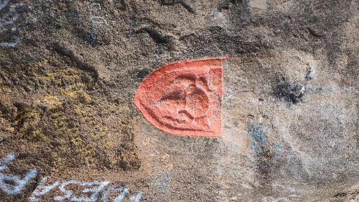 A reddish-orange relief carving of the Hindu deity Ganesha, depicted seated with an elephant head and multiple arms within an arched recess, is integrated into a rough, weathered rock or concrete surface in Kadaladi, India. The surrounding surface exhibits a granular texture with varied coloration, including tones of grey, brown, beige, and yellow. Graffiti in white and yellow pigments is present in the upper left and upper right sections, while faint blue markings are visible on the lower left. Darker smudges and streaks are observable across the surface, particularly below the carving. No individuals are present in the scene. Ambient light illuminates the subject, emphasizing the relief of the carving and the texture of the rock.