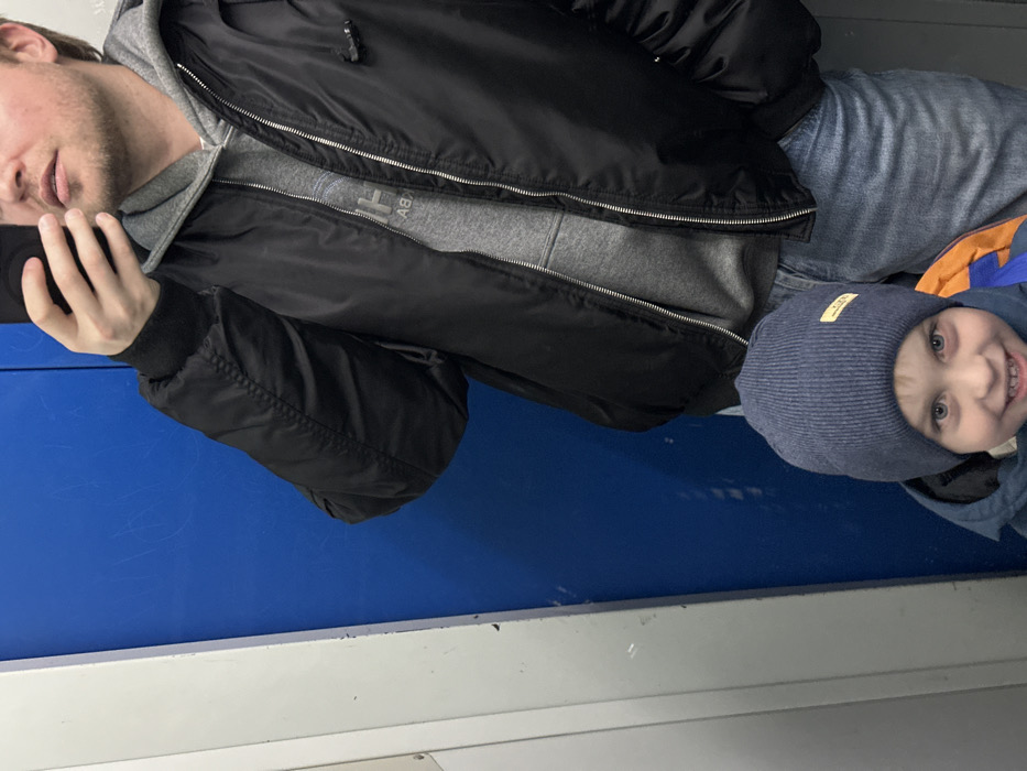 The image depicts two individuals, an adult and a child, captured in what appears to be a mirror selfie within an indoor setting