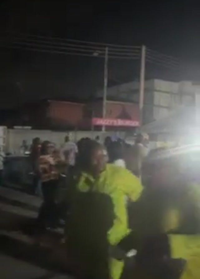 At night, people walk around a street setting near a "JAZZY'S BURGER" sign