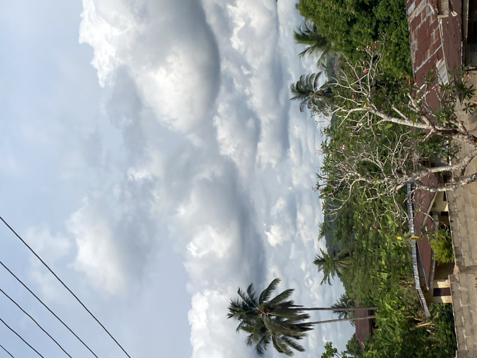 Overcast sky filled with puffy white and gray clouds dominates the scene. Beneath, lush green trees and palm trees form a dense backdrop. A bare-branched tree with some pink flowers stands in the foreground, partially obscuring a glimpse of rooftops and building structures. Power lines diagonally traverse the lower left portion of the frame. The image is oriented vertically.