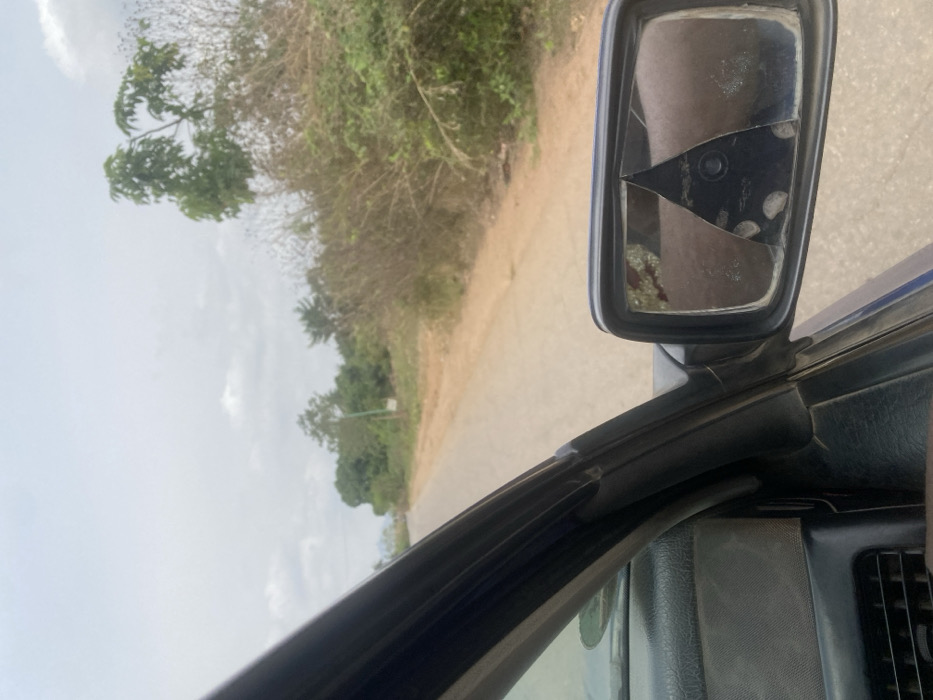 The image displays a rural road scene in Ibillo, Nigeria, viewed from the interior of a vehicle. On the left, a dark vehicle dashboard, an A-pillar, and a portion of the window frame are visible. On the right, a black-framed passenger-side rearview mirror is prominent, exhibiting severe damage to its glass, including a large, triangular crack or missing section in the center and additional fissures. The mirror's reflection is obscured and indistinct. The road ahead is a two-lane surface, likely paved, flanked by dirt shoulders. Dense vegetation, consisting of dry bushes and green foliage, lines the right side of the road, with a taller green tree branch extending upward. On the left, a distant treeline and a light-colored pole are visible further down the road. The sky above is overcast. No individuals are depicted in the scene.