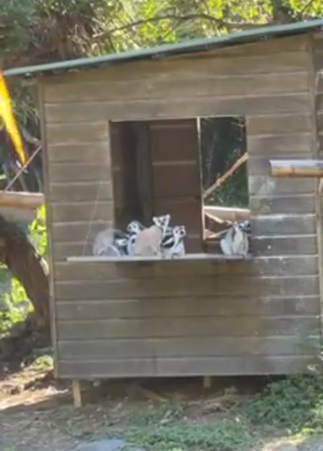 group of ring-tailed lemurs sitting on a ledge of a small wooden structure that resembles a shed or shelter