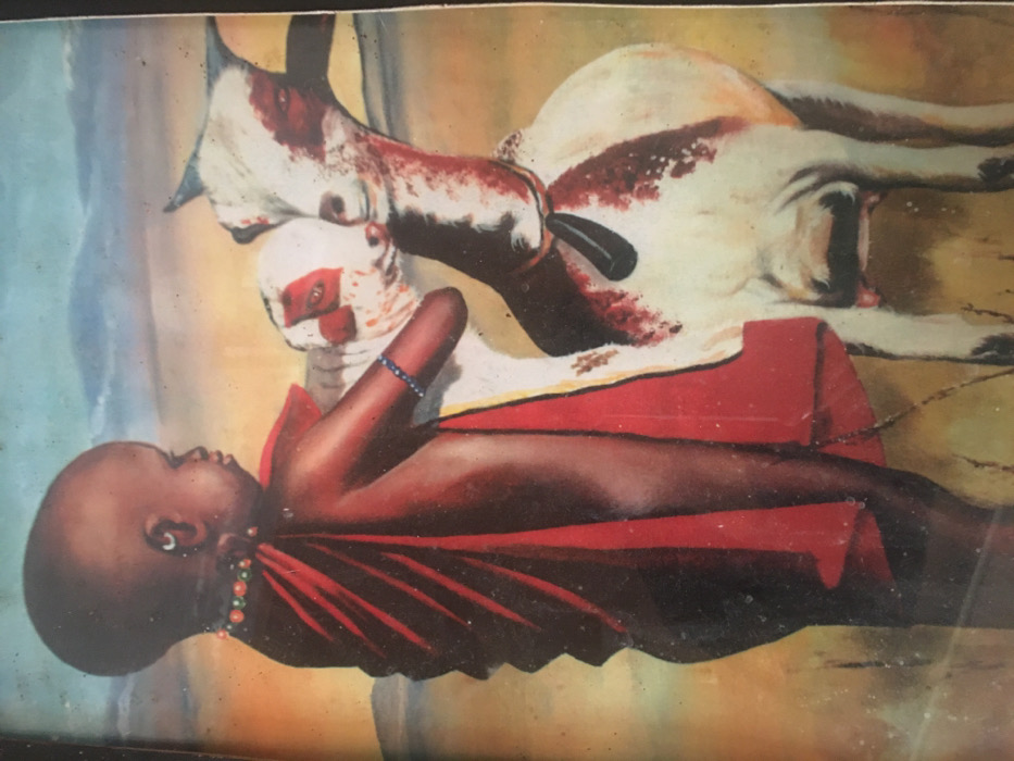 A painting depicts an African child wearing a red garment and adorned with beaded jewelry at the neck and wrist. Above the child, a figure with a white mask and red markings is present, alongside a white animal with brown spots and what appears to be dark liquid around its head. The background is composed of muted colors, suggesting an outdoor or landscape setting.