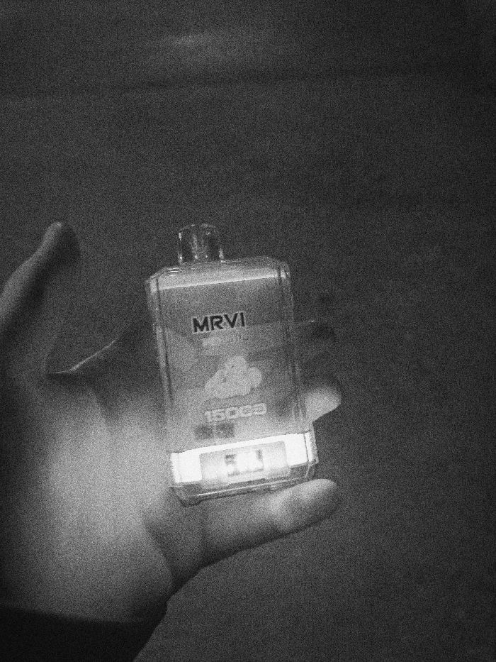 - "The scene depicts a monochrome, close-up shot of an individual's hand holding a transparent, rectangular vaping device, identified as an "MRVI" branded unit with "15000" printed on its body, likely indicating puff capacity" by FM-iHa0r2, licensed under CC BY 4.0
