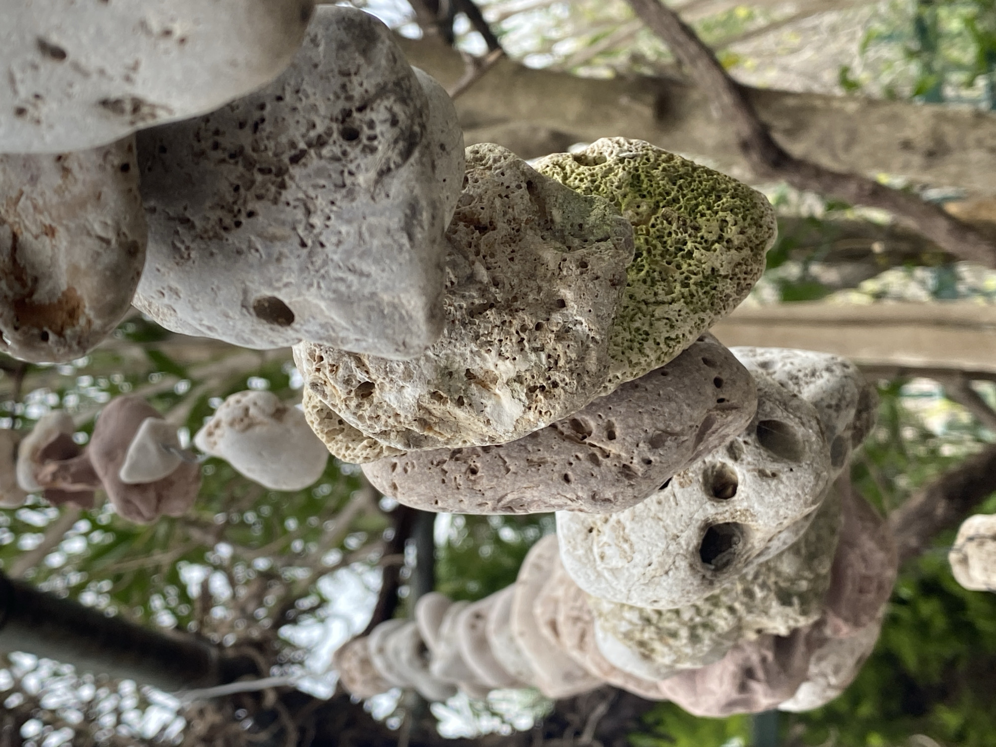 The image captures a close-up, upward-angled view of a suspended string of approximately fifteen natural, weathered rocks or pebbles, located in Podličak, Montenegro. The rocks vary in size, generally ranging from 5 to 10 centimeters, and display a range of colors including off-white, light gray, beige, and brown. A distinct section of one rock exhibits a textured, mottled green growth, likely moss or algae. All visible rocks feature extensive surface pitting and natural perforations, indicative of erosion and porosity. They are threaded sequentially along an unseen line, forming a decorative, cascading arrangement that descends from an overhead attachment point, suggested by a dark, out-of-focus linear object in the upper left. The background is heavily blurred, revealing green foliage and tree branches, consistent with an outdoor, natural environment under diffused natural lighting. No human figures or active interactions are present.