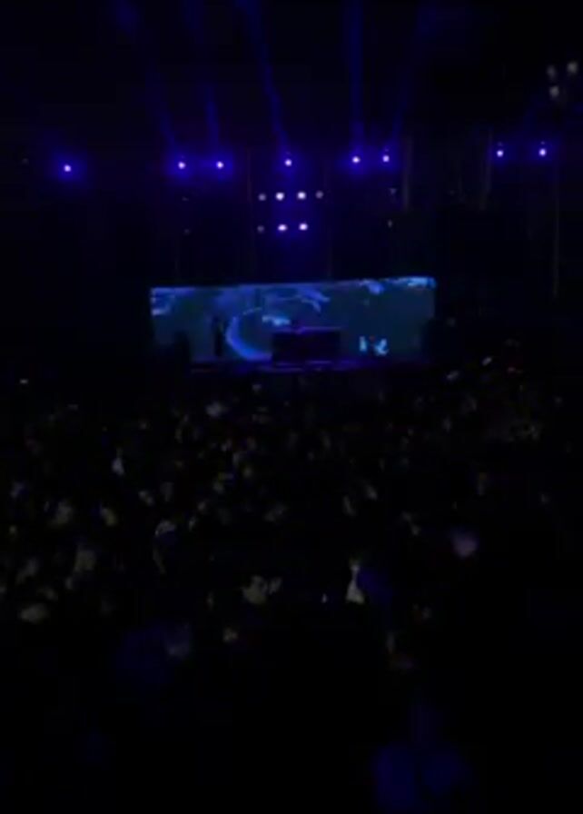 The scene depicts a large crowd gathered at night, illuminated by a stage with blue lighting