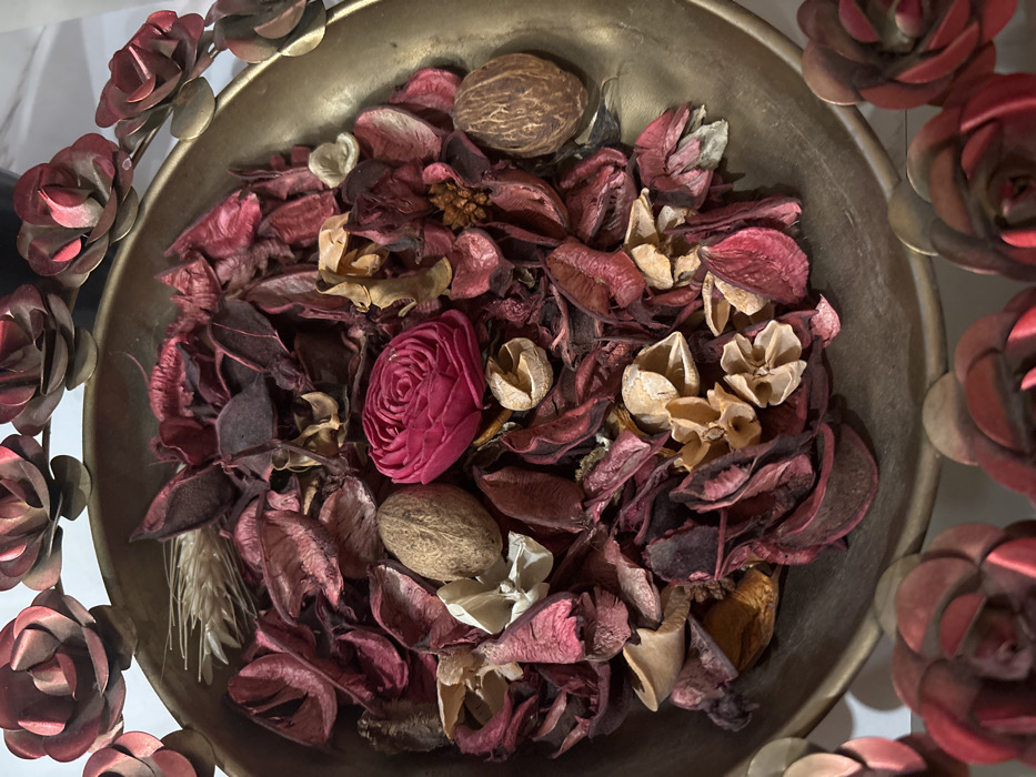 A gold bowl overflows with potpourri. Dried petals in shades of red and burgundy mix with beige seed pods and two walnuts. A bright pink rose head sits in the center. Dark metal roses are arranged around the bowl's edge, some partially visible. The bowl rests on a light marble surface.