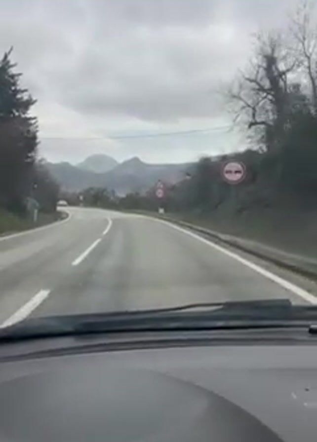 car driving on a paved road on a cloudy day. Mountains are visible in the distance. The car passes road signs, including a "no passing" sign, a speed limit sign (50), and a yield sign. The view is from the driver's seat. The dashboard of the car is visible. There are trees and vegetation on the sides of the road. The road has white lane markings.
