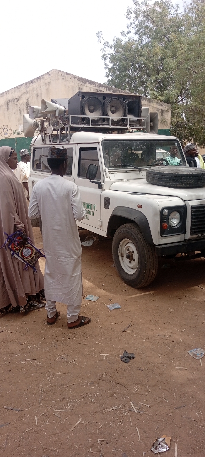 The scene depicts a stationary white Land Rover Defender utility vehicle, equipped with a large public address (PA) system, on an unpaved reddish-brown dirt surface in Dorayi, Nigeria