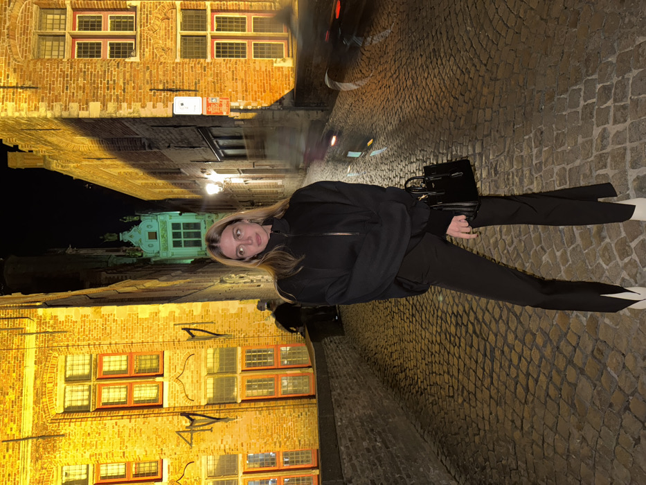 The image depicts a night scene on a narrow, cobbled street in Bruges, Belgium, specifically on Predikherenrei street, looking towards the Poortersloge (Burghers' Lodge). A young adult female stands centrally, facing slightly to her right, looking towards the camera. She has long, blonde hair parted on the left. She is dressed in a black, high-collared, quarter-zip pullover and black trousers featuring split, flared hems at the ankles, revealing white shoes. A black, structured handbag with gold-toned hardware is held in her left hand, resting at her hip. The cobbled street, illuminated by warm artificial light, recedes into the background. On the left, a traditional brick building with multiple red-framed windows borders a low stone wall or bridge railing. A blurred, dark-clad figure is partially visible behind this wall. On the right, another similar brick building with red-framed windows is visible, featuring a street lamp affixed to its facade. Blurred red and white light streaks are present on the right side of the cobblestone street, suggesting passing vehicle lights. In the background, at the end of the street, the ornate, stepped-gable facade of the Poortersloge is prominently illuminated in a distinct turquoise-green light against the dark night sky. The building features multiple windows and a statue at its apex.