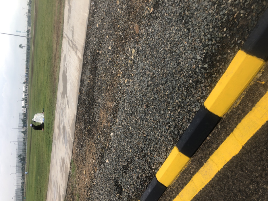 This image depicts an outdoor scene in Hanak, Saudi Arabia, under an overcast sky. In the foreground, asphalt pavement with two parallel yellow lines transitions to a black and yellow striped curb. Beyond the curb, a wide expanse of dark grey gravel is visible. A light grey concrete pathway runs horizontally across the midground, separating the gravel from a large, manicured green grass field. On the green grass in the background, two individuals are engaged in prayer. The individual on the left, dressed in dark clothing and a dark head covering, is positioned in a kneeling or prostration posture on a prayer mat, facing to the right. Slightly to their right and behind, a second individual, dressed in white attire, including a white head covering, is similarly positioned in a kneeling or prostration posture on a prayer mat, also facing to the right. Further into the background, the green field extends, bordered by a mesh fence and several utility poles. Distant structures and a lone palm tree are visible on the far right horizon.