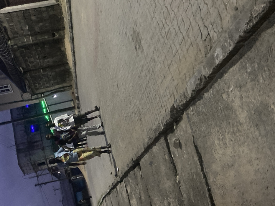 This image depicts a street scene at dusk or night in Yenegoa, Nigeria. The foreground features a cracked and uneven concrete sidewalk on the left, transitioning to a paved road constructed with interlocking concrete blocks. A small, light-colored object, possibly a stone, rests on the sidewalk. In the midground, a group of at least three individuals is present on the paved road. On the far left, an individual wearing a light blue top and a patterned yellow skirt or wrap is walking towards the left. To their right, another individual wears a dark t-shirt and light trousers. Adjacent to them, a third individual wears a white graphic t-shirt and dark shorts. All three appear to be wearing sandals or slippers. Additional individuals are partially visible behind this primary group. The background includes several urban structures. On the left, a multi-story building, possibly under construction or in disrepair, is visible with scaffolding. Blue and green linear artificial lights illuminate this general area. To the right, a building with a gray brick wall is topped with razor wire. A white-framed window is visible on an upper floor of this structure. Utility poles and wires are also discernible on the far left. The sky is dark, indicating the time of day.