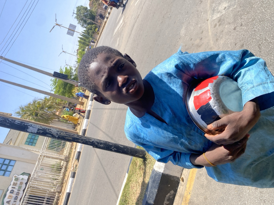 The image captures a young male individual, likely a child, positioned in the foreground of a sunlit urban street in Kaduna, Nigeria