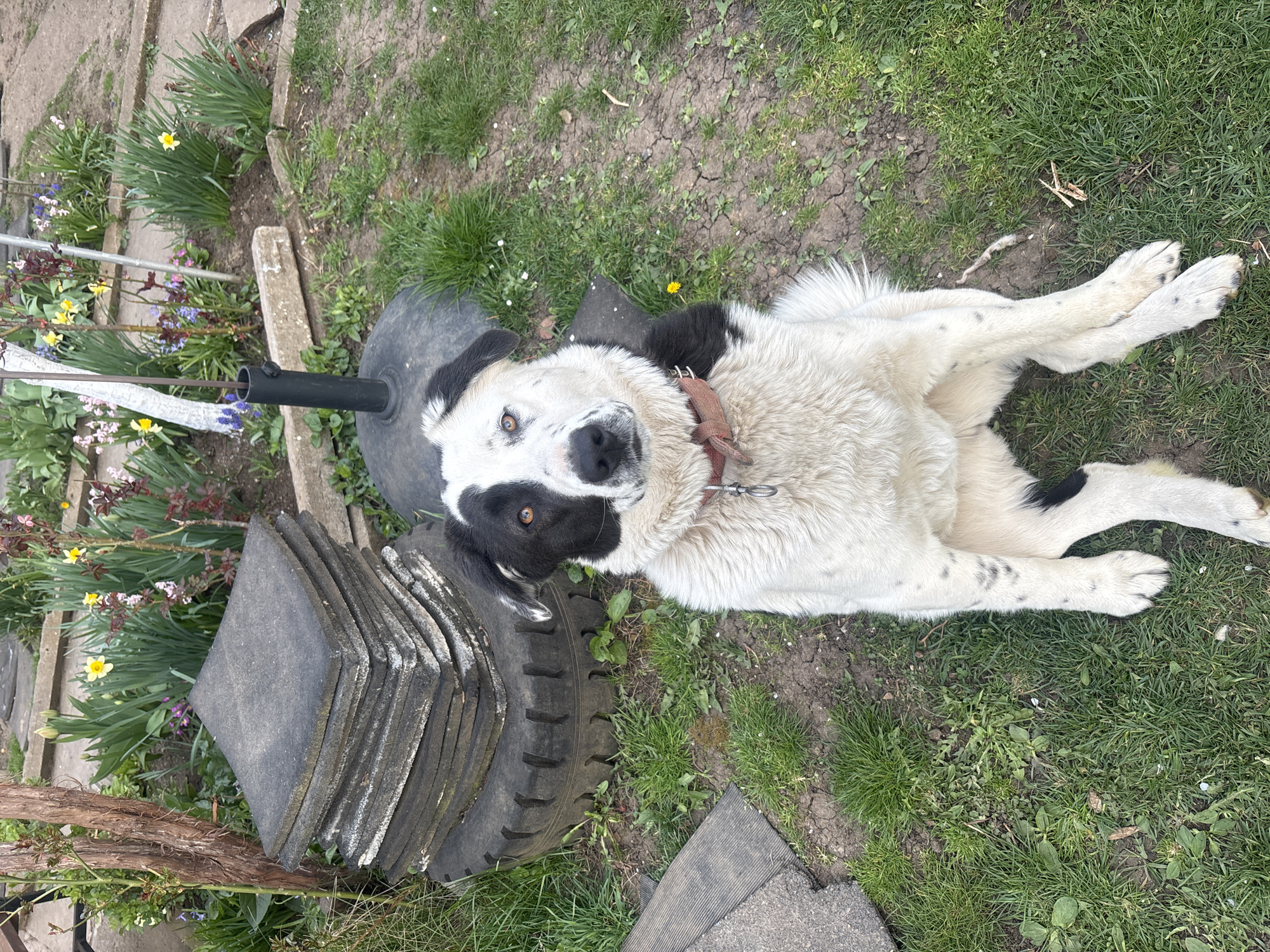dog lying on the ground in a garden setting, presumably in Dolna Dikanya, Bulgaria. The dog is large, predominantly white with black patches, and has a brown collar. It is lying on its back with its legs spread out. The surrounding environment includes grass, soil, and various objects such as a stack of gray tiles, a black tire, and a black umbrella stand. There are also flowers and other plants visible along the edge of the garden. The scene is outdoors and appears to be taken during the daytime.