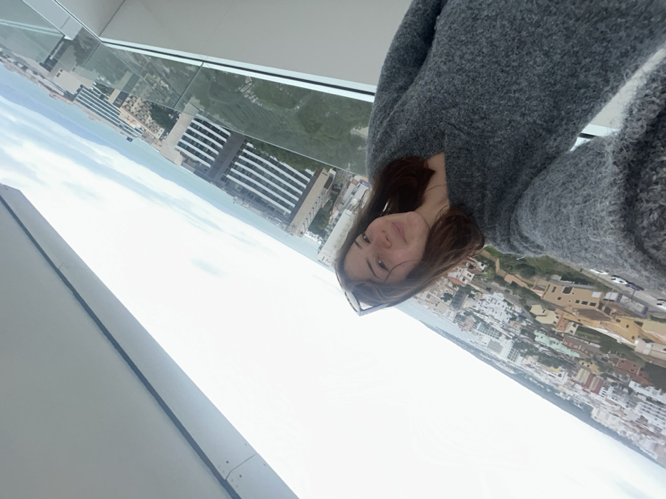 A young Caucasian female is depicted in a selfie photograph taken from an elevated position, likely a high-rise balcony, overlooking the city of Les Meravelles, Spain