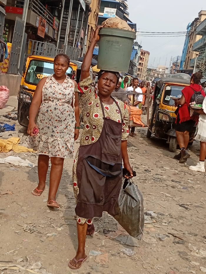 A woman balances a green bucket filled with an unknown object on her head. She holds a black plastic bag in her hand. She wears a patterned shirt, brown apron-like garment, and flip-flops. Another woman in a floral dress and flip-flops stands beside her. The scene is on a street with debris-covered ground, auto rickshaws, and other people visible in the background. Buildings line the street.