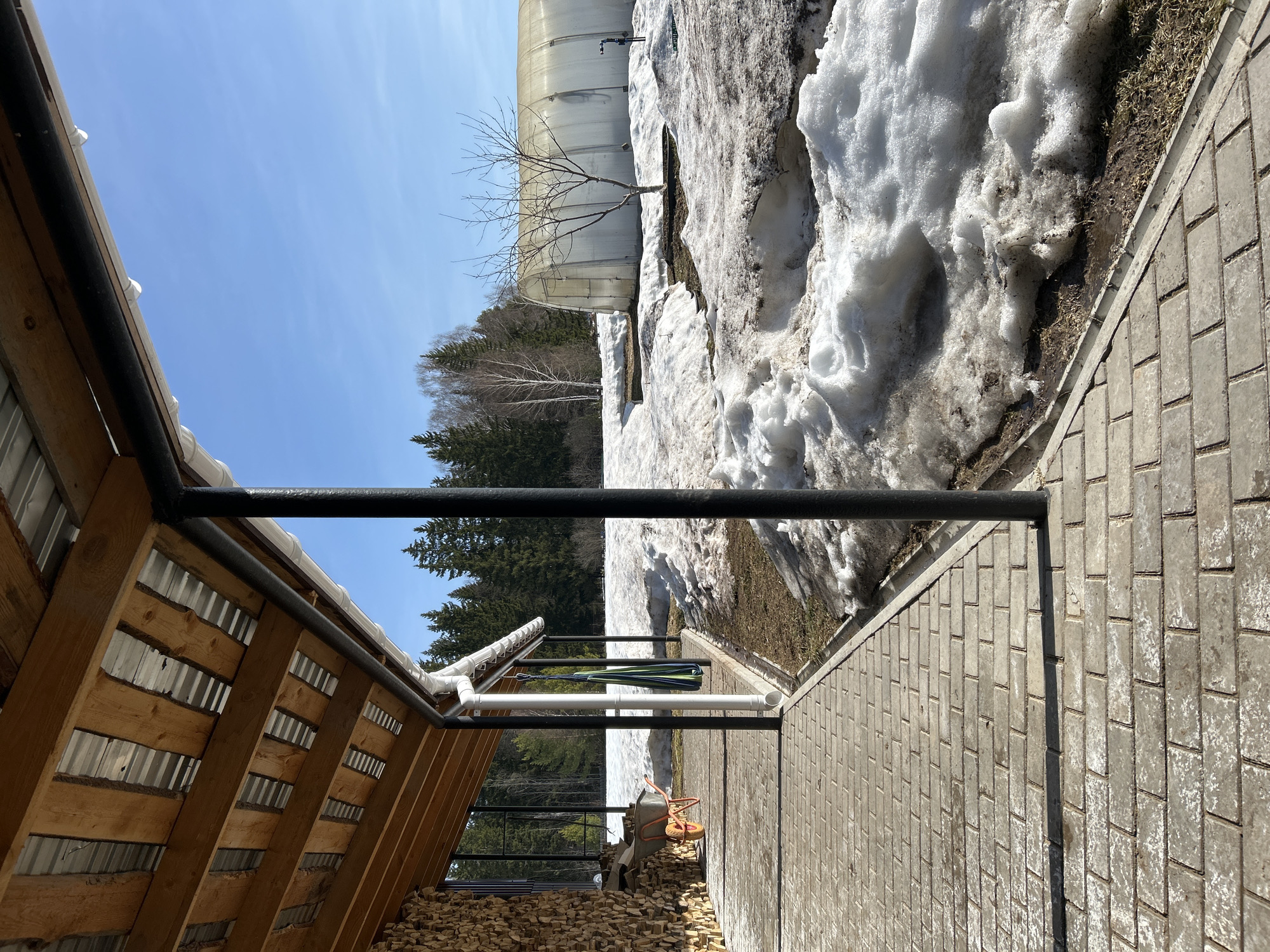 partially snow-covered landscape, likely in the early spring, in the city of Уральское, Russia. The foreground features a paved walkway made of grey rectangular blocks. Adjacent to the walkway is a patch of land covered with melting snow, revealing patches of dry grass and dirt. In the background, there's a forest with deciduous and evergreen trees. A greenhouse-like structure is also visible. On the left side of the frame, there's a wooden structure with a metal roof. The structure seems to be filled with stacked firewood. A metal pipe structure is visible above the roof. A wheelbarrow with gardening tools sits adjacent to the walkway.
