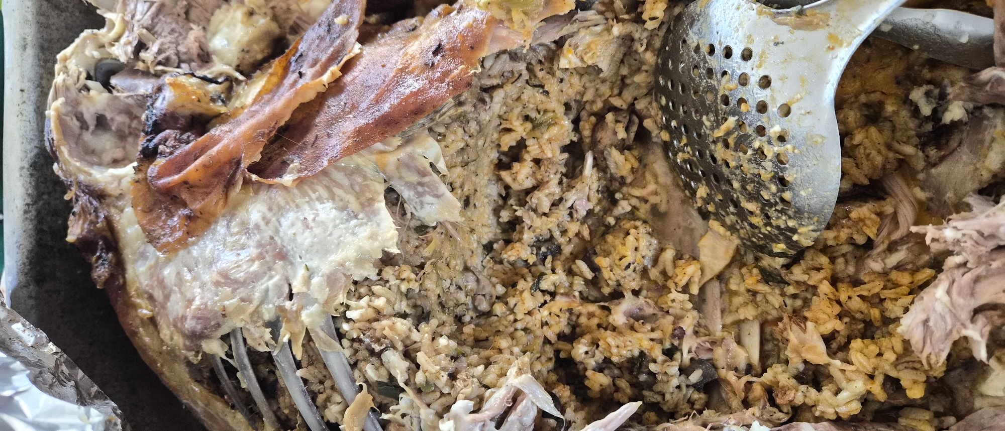 close-up of a cooked animal, likely a whole pig, that has been stuffed with a rice-based filling