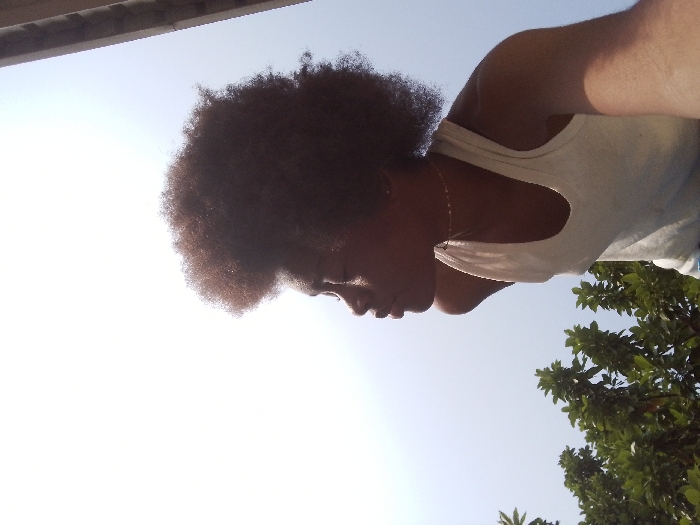 The scene is located in the city of Unknown, Unknown. A dark-skinned individual, appearing to be an adult, is depicted from the mid-torso up, positioned in profile facing left. The person has dark, voluminous afro-style hair, wears a white tank top, and a thin, light-colored choker necklace. Their eyes are closed or heavily squinted, and the mouth is slightly open, suggesting a reaction to bright light or a specific gaze. The individual's left arm is visible, bent at the elbow and extending towards the lower right corner of the frame. The background is dominated by a bright, overexposed sky, indicating a sunny outdoor environment. Dark green foliage from trees or bushes is visible in the lower-left quadrant, and a light-colored vertical structure, possibly a building element, is partially visible along the extreme right edge of the frame. The subject is partially backlit against the bright sky.