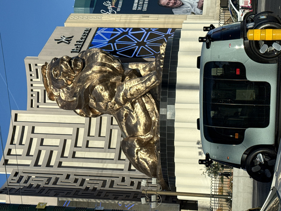 The image captures an urban street scene in Paradise, Nevada, United States of America, under a clear blue sky. A large, prominent golden lion statue is centrally positioned, depicted in a seated posture and facing slightly to the viewer's right. The statue rests on a multi-tiered pedestal featuring a black top and a white, fluted lower section. Behind the lion, various buildings typical of a resort complex are visible. The main background structure is a light-colored building with an intricate facade characterized by deep-set, geometric rectangular patterns. To the right of this building, another structure displays a "Hakkasan" sign with a stylized 'K' logo, positioned above a large blue digital display exhibiting a repeating geometric pattern. Further to the right, a vertical billboard advertises "Emerald's" and features a smiling male chef in a white uniform. In the immediate foreground, a light blue-grey autonomous Zoox vehicle is partially visible, oriented towards the right. This vehicle features multiple sensor arrays on its roof and front corners, dark tinted windows, and a distinctive compact design with four wheels. The front left corner of a white car is partially visible to the left of the autonomous vehicle. A yellow cylindrical bollard is present on the street to the right of the autonomous vehicle. A street light pole with multiple fixtures extends from the left side of the image, positioned behind the autonomous vehicle and beside the lion's pedestal. A black metal fence separates the street from the area surrounding the lion statue.