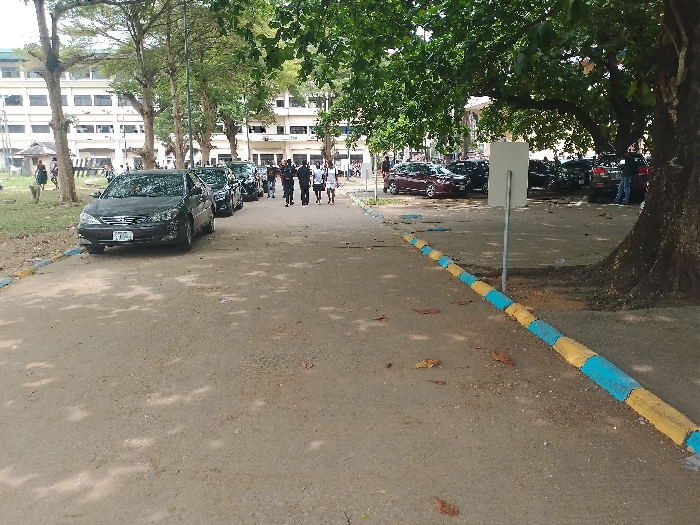The scene depicts an outdoor university or institutional campus environment in Port Harcourt, Nigeria, under diffused daylight conditions. A wide, unpaved pathway of dirt and gravel extends from the foreground into the midground. The right edge of this pathway is delineated by a concrete curb painted in alternating blue and yellow segments. Scattered dry leaves are visible on the ground surface. To the left of the pathway, a line of at least six dark-colored sedans is parked, facing away from the viewer. The foremost vehicle is a dark grey Toyota Camry with a Nigerian license plate (partially visible, featuring a green stripe). Behind these vehicles, a group of approximately 6-8 individuals walks along the pathway, moving away from the camera's perspective. Several individuals in this group wear light-colored shirts and dark trousers; one person is dressed in a dark suit jacket. On the right side of the image, a large tree trunk rises vertically, its canopy extending overhead, providing shade to parked vehicles further in the midground. A blank, rectangular sign on a metal pole stands upright between the pathway and the tree trunk. In the background, multiple light-colored, multi-story institutional buildings with numerous windows are visible, indicative of a university campus or similar complex. These buildings are partially obscured by extensive green foliage from mature trees that punctuate the landscape. Additional pedestrians are present in the distant left background on a grassy area.