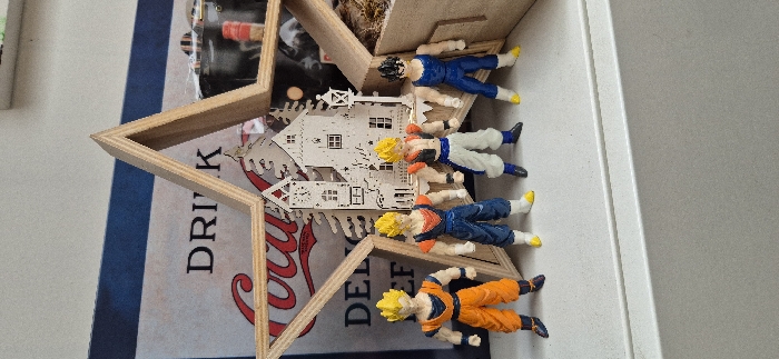 The scene, located in a private residence in Liévin, France, presents four Dragon Ball action figures standing in a linear arrangement on a white horizontal surface. From left to right, the figures are identifiable as Super Saiyan Goku (orange gi, blue undershirt, yellow hair), Super Saiyan Vegito (blue and orange gi, yellow hair), Super Saiyan Gogeta (blue, white, and black attire with orange accents, yellow hair), and Vegeta (blue battle suit, black hair). All figures are static, facing forward. Behind the figures, a light-toned, hollow wooden star-shaped frame is positioned. Within the central opening of this frame, a white, intricately cut wooden silhouette of a house with a clock tower and a street lamp serves as a decorative backdrop. Further in the background, a vertical sign or poster is partially visible, featuring blue and white stripes with red text that includes "DRINK" at the top and "DEL CEF" below. The far right section of the wooden star contains dried organic material and several indistinct objects.