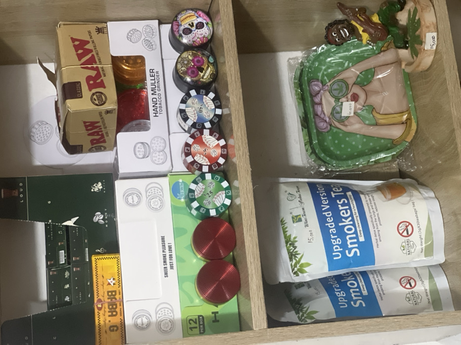 This image depicts a retail shelving unit, likely within a shop, located in an indoor setting in Lokoja, Nigeria. The scene is static, featuring a variety of packaged goods and accessories displayed on two light-colored wooden shelves. No individuals are present. On the upper shelf, merchandise is arranged across its length. From left to right, a partially visible dark green cardboard box labeled "LOUD" stands above a yellow box marked "BABA G." Below these, a white rectangular box states "SHEER SMOKE PLEASURE JUST FOR LOVE!" and a green box reads "12 PER BOX." Positioned centrally are two red, circular, ridged metallic objects. To their right, a line of six decorative circular items, resembling poker chips or grinders, includes two green ones marked "25" with playing card symbols, two red ones marked "5" with playing card symbols, two blue ones marked "05" with playing card symbols, and two black ones featuring vibrant skull designs. On the right side of the upper shelf, a brown cardboard box labeled "RAW CLASSIC NATURAL UNREFINED ROLLING PAPERS" is stacked above a clear plastic package containing several colorful hand grinders (red, orange, green, blue). Adjacent to this is a white box for a "HAND MULLER TOBACCO GRINDER," which displays illustrative diagrams of grinders. The lower shelf holds larger items. On the left, two white pouches are labeled "Upgraded Version Smokers Tea," indicating "Deep cleaning for a healthy lifestyle" and "Herbal detox specifically prepared to reduce smoking from the lungs," with a net weight of "3g X 30 teabags." A price tag displaying "1,500" is visible on one pouch. Centrally, a green, rectangular metal rolling tray, wrapped in clear plastic, features white polka dots and a stylized illustration of a woman wearing large, round green sunglasses adorned with cannabis leaf motifs. This tray has a price tag of "4,000." On the far right, a small ceramic or resin figurine portrays a male character with dreadlocks, wearing a yellow shirt and green pants, holding a brown guitar. The figurine stands on a base decorated with green leaf motifs, and a "1,500" price tag is attached to its base.