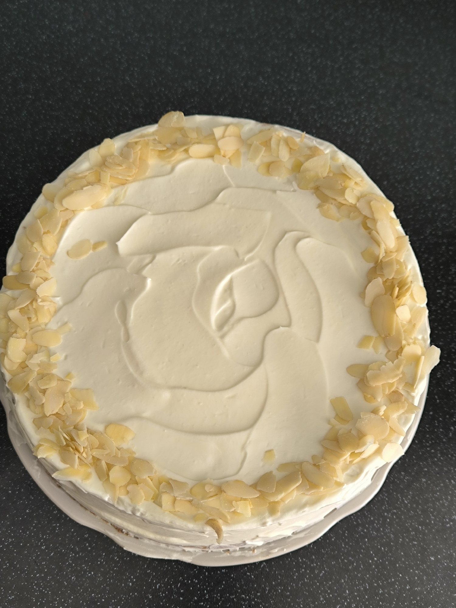 The scene is an indoor setting in Vinnytsia, Ukraine. A whole, round cake is centrally positioned, resting on a white, scalloped-edge plate. The cake is covered with a thick layer of white or off-white frosting, exhibiting visible swirled textures on its top surface. The perimeter of the cake's frosted top is garnished with a border of light brown and tan slivered almonds. The cake plate is situated on a dark, possibly speckled countertop or table surface. No individuals or active interactions are present in the image.