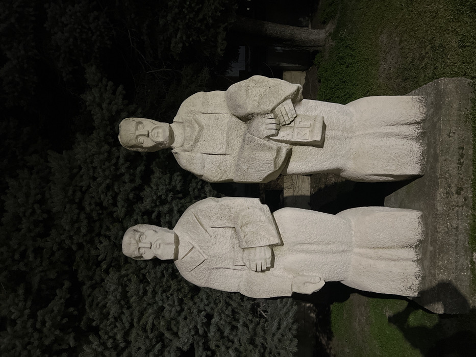 - "The scene depicts two monumental, stylized stone statues of male figures, illuminated at night, in an outdoor public space in the city of Rakovski, Bulgaria" by FM-yFnm82, licensed under CC BY 4.0