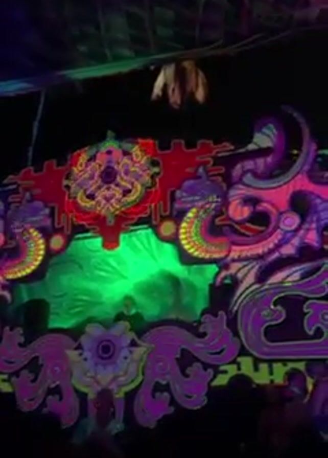 brightly lit, psychedelic stage at night. The stage backdrop features fluorescent designs in red, green, pink, and yellow. These designs include what appear to be dragons or other mythical creatures along the sides, and a central ornament above a green-lit area. Above the stage, netting with purple, green, and blue accents is visible, along with some foliage. Below the stage, the silhouettes of a crowd can be seen, with some people raising their hands in the air. The scene suggests a festival or a music event.