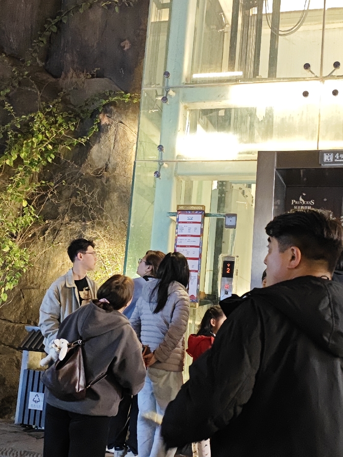 The image depicts an urban scene in Nan'an District, China, at an outdoor glass elevator complex built against a natural rock formation. Approximately seven individuals are gathered near the elevator entrance. On the left, a dark, rugged rock wall covered with green climbing vines extends vertically. A light fixture is mounted on this wall, illuminating the area. To the right of the rock wall stands a multi-story glass elevator shaft, constructed with light-colored frames and transparent glass panels secured by silver spider fittings. An elevator control panel on a dark surface displays an illuminated '2', indicating the current floor. A tall, narrow information sign with red and white text, along with a darker panel displaying "Princess" and "公主的环球", is affixed to the elevator structure. In the foreground on the right, the back and right profile of a man with short dark hair, wearing a black hooded jacket, is visible; he faces away from the elevator. In the mid-ground, a person wearing a dark grey hooded sweatshirt and black pants carries a brown backpack with a small white plush toy attached; this individual faces the elevator. To their right, a woman in a light-colored puffer jacket and light pants stands, also facing the elevator. Further left, partially obscured, a young man with dark hair and glasses, wearing a light-colored jacket over a dark t-shirt, looks towards the right. Other indistinct figures are partially visible further into the scene. A dark grey public waste bin with a recycling symbol is located on the far left at the base of the rock wall.